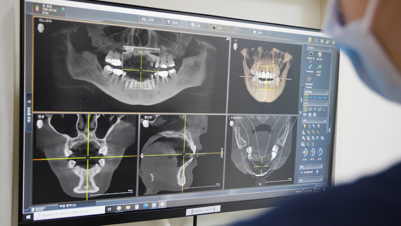 통증의 원인이 치아 내부의 신경이나 뼈와 관련이 있다고 의심될 때, 3D-CT를 통해 치아 뿌리 상태를 3차원으로 확인합니다. 신경치료의 성공률을 높이고, 발치 여부를 결정의 중요한 근거가 됩니다.