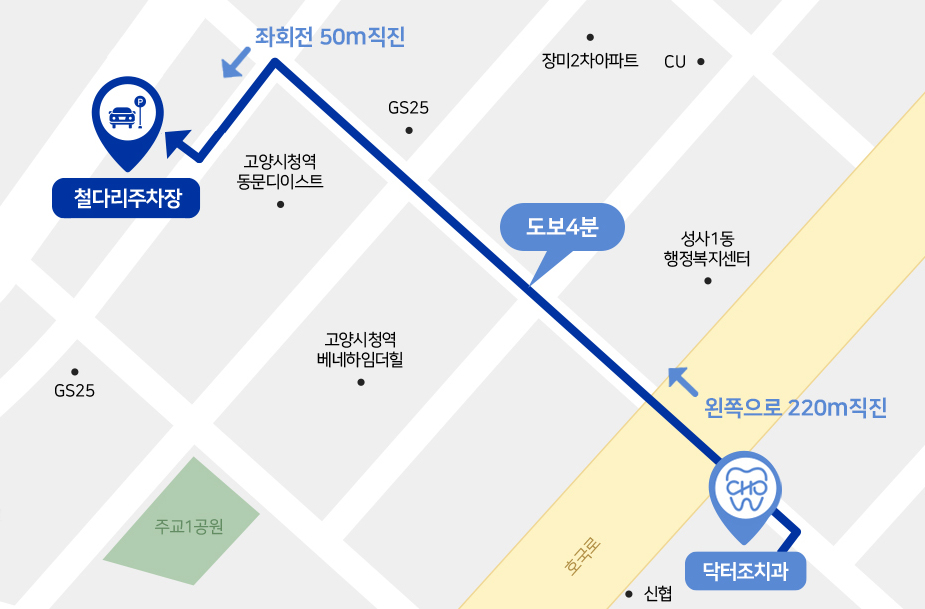 | 닥터조치과 건물에서 나오자마자 왼쪽으로 220m 직진 (도보 3분) 철다리 지나기 전 왼쪽 골목으로 좌회전하시면 50m (도보 1분) 앞에 무료로 이용할 수 있는 '철다리 주차장'이 있습니다. |